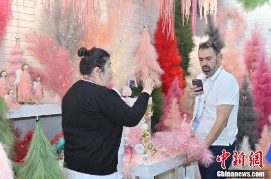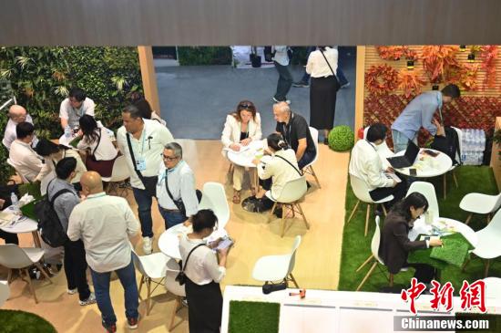 第136屆廣交會第二期的園林用品展區(qū)吸引采購商(右)咨詢洽談。