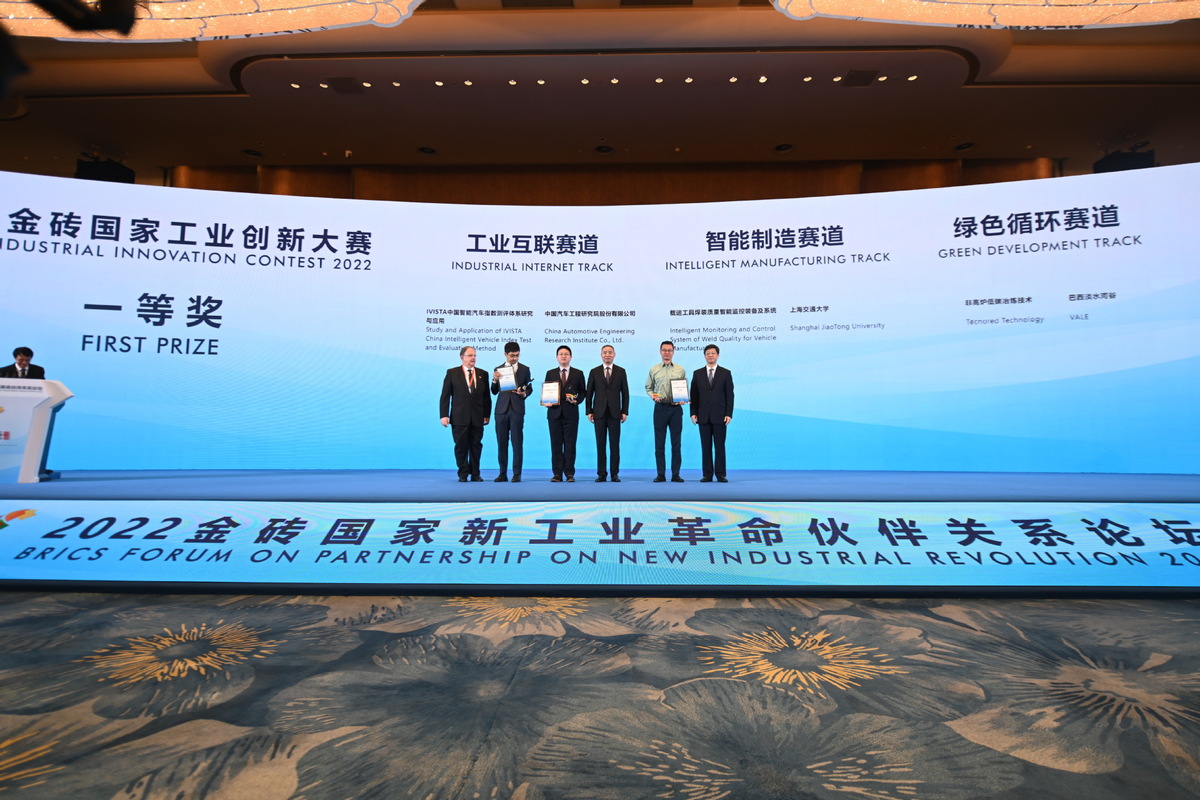 2022年9月7日,2022金磚國(guó)家工業(yè)創(chuàng)新大賽一等獎(jiǎng)獲得者和頒獎(jiǎng)嘉賓在廈門(mén)合影。(圖片來(lái)源:新華社)