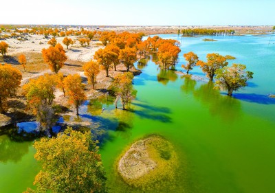 站在高處放眼望去,大片的胡楊林仿佛被溫柔的霞光所籠罩,明黃色的胡楊葉如同滿天繁星,在水面上輕輕搖曳。走進(jìn)胡楊林深處,可見漢唐烽燧、太陽(yáng)墓、祭臺(tái),每一處文化遺存都透著原始與神秘,仿佛將一個(gè)個(gè)古老的傳說向人娓娓道來。