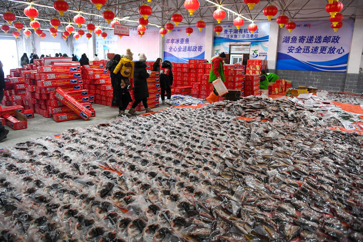 2023年12月27日,游客在查干湖漁場(chǎng)超市選購(gòu)查干湖魚(yú)。新華社記者 張楠 攝