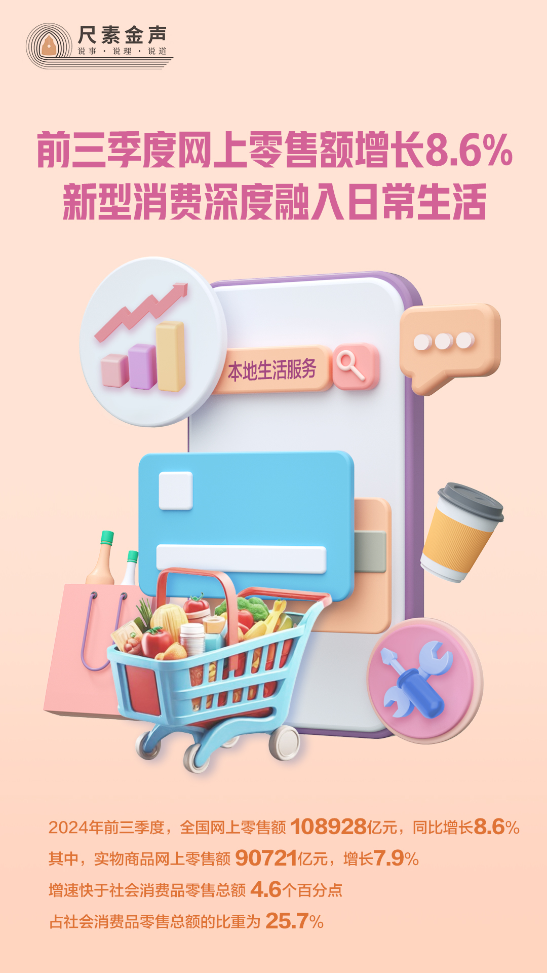 最新數(shù)據(jù)顯示,今年前三季度,全國網(wǎng)上零售額108928億元,同比增長8.6%。其中,實(shí)物商品網(wǎng)上零售額90721億元,增長7.9%,增速快于社會消費(fèi)品零售總額4.6個百分點(diǎn),占社會消費(fèi)品零售總額的比重為25.7%。本地生活服務(wù)等新型消費(fèi)快速增長,對線上消費(fèi)增長起到明顯的拉動作用。