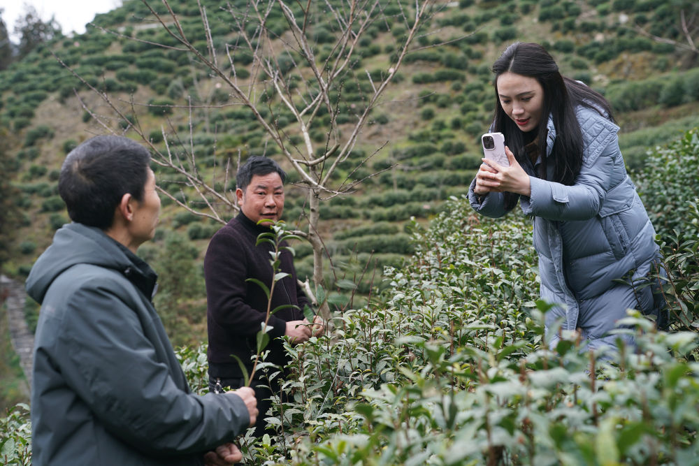 林紅梅(右一)在安康市紫陽縣城關鎮(zhèn)一處茶山上拍攝記錄茶園春管情況。新華社記者 邵瑞 攝