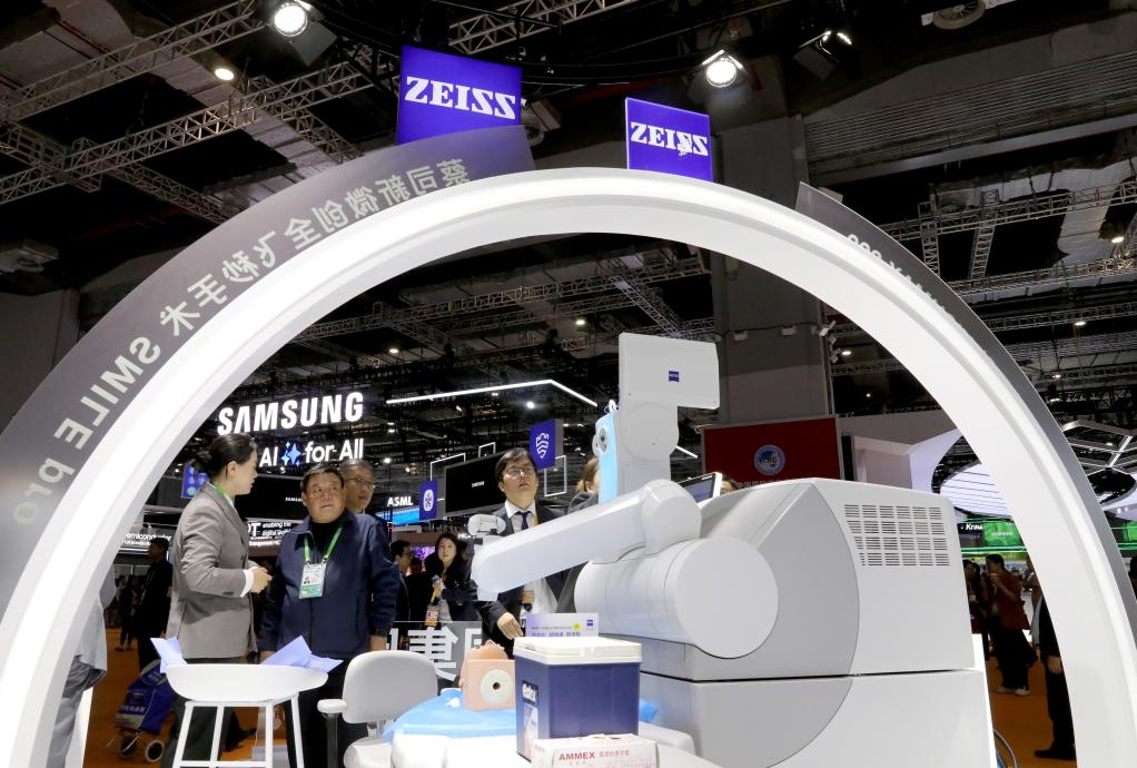 11月6日,參觀者在蔡司公司展臺(tái)展出的新一代機(jī)器人全飛秒前交流討論。這是該產(chǎn)品在進(jìn)博會(huì)上的首展。新華社記者 方喆 攝
