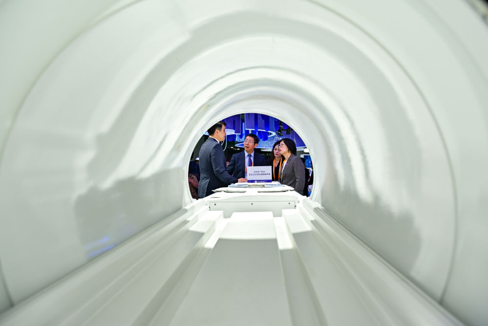 11月5日,人們?cè)诘谄邔眠M(jìn)博會(huì)醫(yī)療器械及醫(yī)藥保健展區(qū)GE醫(yī)療展臺(tái)了解一款讀秒成像磁共振儀器。新華社記者 張鋮 攝