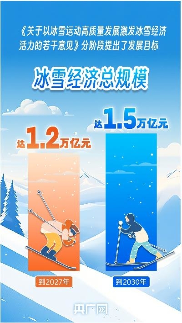 近日,國務院辦公廳公開發(fā)布《關于以冰雪運動高質(zhì)量發(fā)展激發(fā)冰雪經(jīng)濟活力的若干意見》(以下簡稱《意見》),分階段提出發(fā)展目標:到2027年,冰雪運動場地設施更加完善,服務水平顯著提升,冰雪運動更加廣泛開展,冰雪經(jīng)濟總規(guī)模達1.2萬億元。到2030年,冰雪經(jīng)濟主要產(chǎn)業(yè)鏈條實現(xiàn)高水平協(xié)調(diào)融合發(fā)展,冰雪消費成為擴大內(nèi)需的重要增長點,冰雪經(jīng)濟總規(guī)模達1.5萬億元。