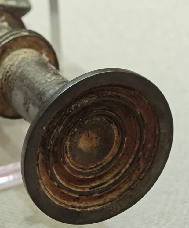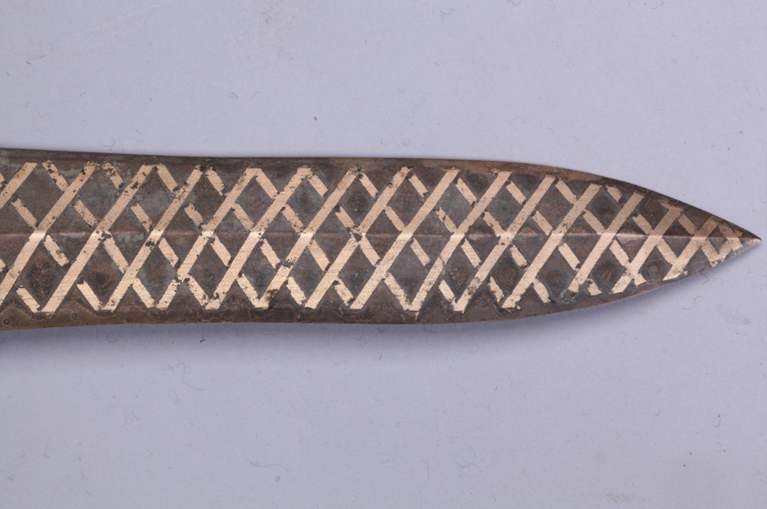 這把青銅劍通長(zhǎng)58.3厘米,劍身寬大厚重,在前部有一個(gè)明顯變窄,可以提高劍的刺穿能力,劍尖雖然只有極尖銳的一點(diǎn),但不可思議的是,在高倍放大鏡下仍然可以看出有六至八個(gè)截面。劍身雖然光素,仔細(xì)觀察會(huì)發(fā)現(xiàn)寶劍通體泛著幽幽的神秘藍(lán)光,劍格上鑄出獸面紋,鑲嵌的綠松石有一面已經(jīng)脫落,劍身近格處鑄有兩行銘文:“攻敔(吳)王夫差自乍(作)其元用”,表明這把劍的擁有者是吳國(guó)歷史上大名鼎鼎的吳王夫差。