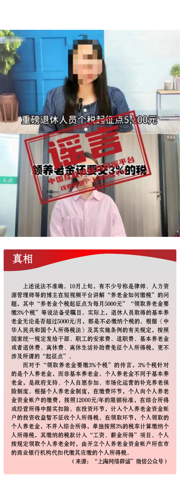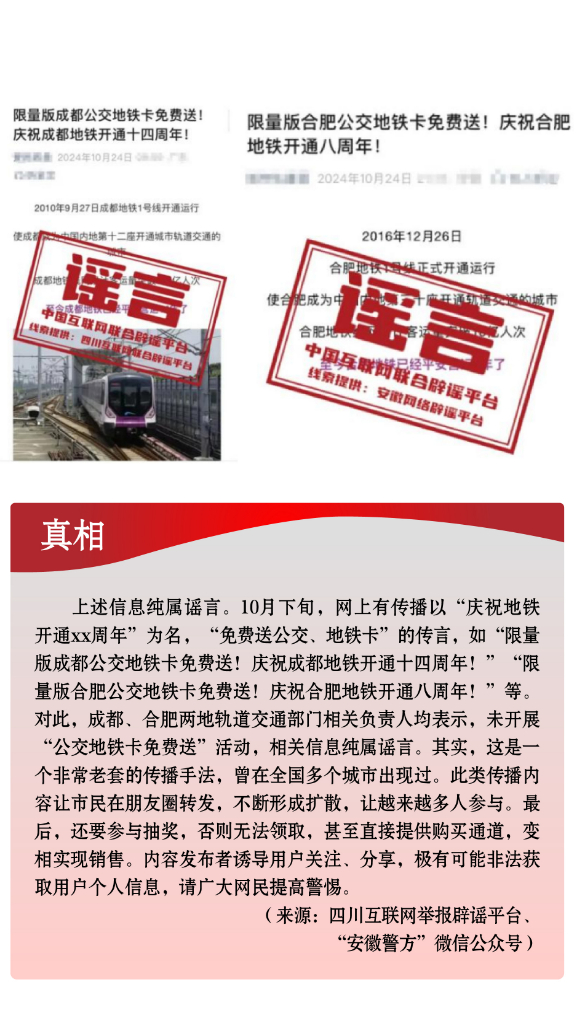 假冒官方虛構政策。一些不法分子冒充權威機構,散布涉公共政策類謠言,誤導公眾認知。有的假借官方名義,偽造政策文件,實則行騙牟利,侵犯群眾利益。如有人利用公眾對“大數(shù)據(jù)”“數(shù)字經(jīng)濟”等內(nèi)容的認知盲區(qū),假借“國家數(shù)據(jù)局”“中國人民銀行數(shù)字貨幣研究所”等官方名義,偽造政策文件,謠稱“國家數(shù)據(jù)局頒發(fā)‘個人數(shù)據(jù)資產(chǎn)擁有權確權憑證’”“數(shù)字人民幣平臺將發(fā)放‘數(shù)字資產(chǎn)紅利’”,相關部門均已發(fā)布辟謠聲明。有的從公開發(fā)布的政策信息中摘取碎片化信息,斷章取義,對政策歪曲解讀。如個別自媒體故意混淆“個人養(yǎng)老金”與“基本養(yǎng)老金”的概念,傳播“領取養(yǎng)老金要繳3%個稅”“養(yǎng)老金個稅起征點為5000元”等不實信息,引發(fā)公眾誤解。另有“成都、合肥等地免費送公交地鐵卡”謠言,以“免費”“贈送”為噱頭,誘導用戶關注、分享,最終可能導致用戶遭受個人信息泄露或其他不法侵害。