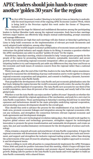 原標題:APEC leaders should join hands to ensure another 'golden 30 years' for the region