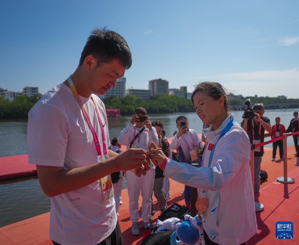 在28日的獨(dú)竹漂女子組200米直道賽中,海南代表團(tuán)選手何國潤在“一葦渡江”的驚險后又經(jīng)歷了驚喜,獲得該項(xiàng)目三等獎的她在頒獎儀式后被男友浪漫求婚。在現(xiàn)場的參賽選手、媒體記者和觀眾的見證下,這對情侶相擁而吻,這一刻,波光粼粼的三亞河化身為愛河。