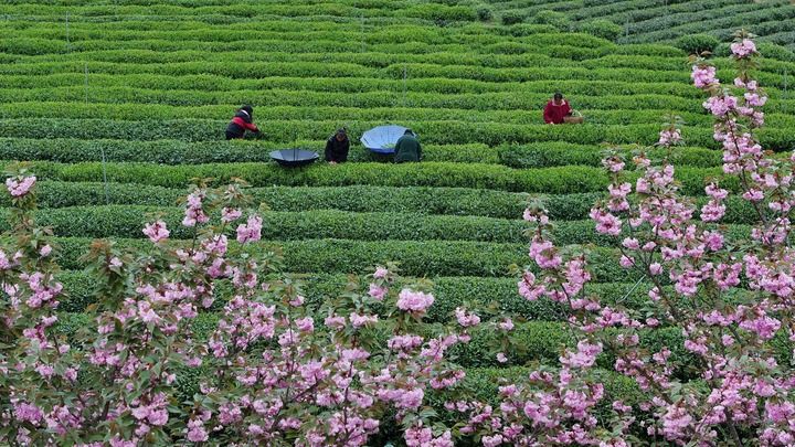 2024年4月6日,村民在貴州省遵義市鳳岡縣永安鎮(zhèn)田壩社區(qū)茶葉基地采摘春茶(無人機照片)。新華社發(fā)(王超 攝)