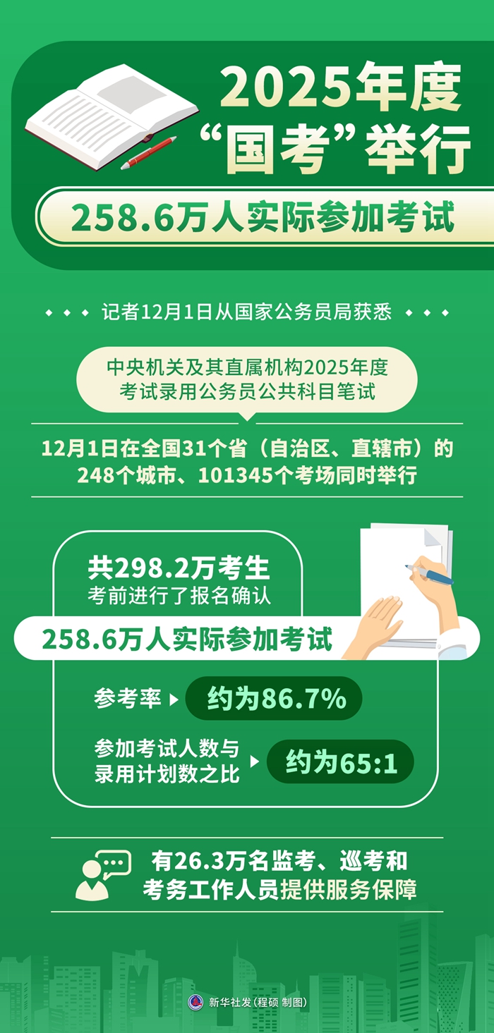 新華社北京12月1日電 記者1日從國家公務(wù)員局獲悉,中央機關(guān)及其直屬機構(gòu)2025年度考試錄用公務(wù)員公共科目筆試1日在全國31個?。ㄗ灾螀^(qū)、直轄市)的248個城市、101345個考場同時舉行,共298.2萬考生考前進行了報名確認、258.6萬人實際參加考試,參考率約為86.7%,參加考試人數(shù)與錄用計劃數(shù)之比約為65:1,有26.3萬名監(jiān)考、巡考和考務(wù)工作人員提供服務(wù)保障。