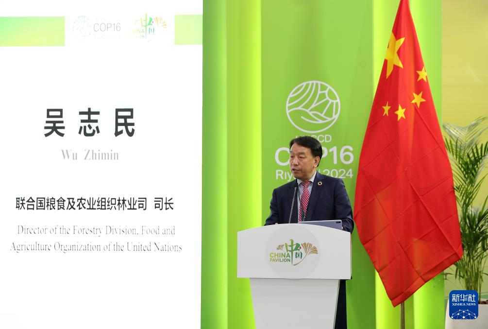 12月4日,在沙特阿拉伯利雅得,聯(lián)合國糧食及農(nóng)業(yè)組織林業(yè)司司長(zhǎng)吳志民在《聯(lián)合國防治荒漠化公約》第十六次締約方大會(huì)(COP16)中國館舉辦的邊會(huì)上發(fā)言。新華社記者 王東震 攝