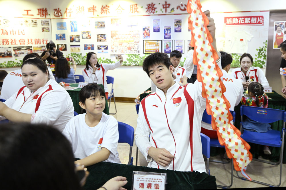 9月2日,在澳門工聯(lián)氹仔湖畔綜合服務(wù)中心,游泳運(yùn)動(dòng)員潘展樂(右)展示與小朋友一起制作的燈籠。新華社發(fā)