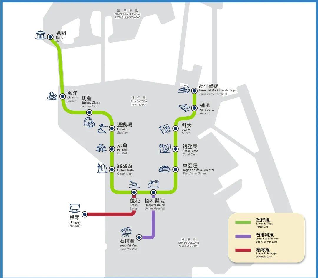 橫琴線全長(zhǎng)約2.2公里,設(shè)有蓮花站、橫琴站兩個(gè)車站,全程行車時(shí)間約2分鐘,班次約6分鐘一班。