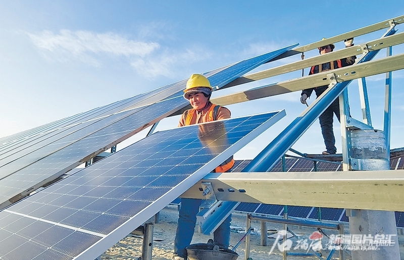 12月1日,位于和田市吉亞鄉(xiāng)的華潤新能源50萬千瓦光伏治沙項(xiàng)目施工現(xiàn)場一派熱火朝天景象。該項(xiàng)目總投資約15億元,預(yù)計(jì)明年5月底實(shí)現(xiàn)全容量投產(chǎn)。圖為工人在鋪設(shè)光伏板。 石榴云/新疆日報(bào)記者 湯永攝