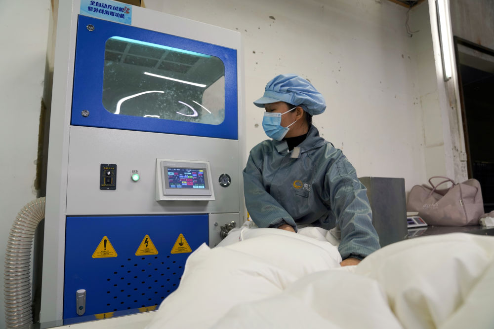 在橋圩鎮(zhèn)一家羽絨制品生產(chǎn)車間內(nèi),工人使用全自動充絨機制作羽絨被。新華社記者 楊馳 攝