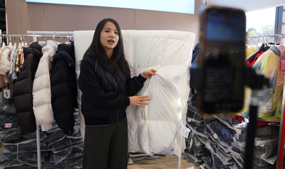 在橋圩羽絨產(chǎn)業(yè)園展示廳,銷售人員正在直播介紹當?shù)厣a(chǎn)的羽絨被。新華社記者 楊馳 攝