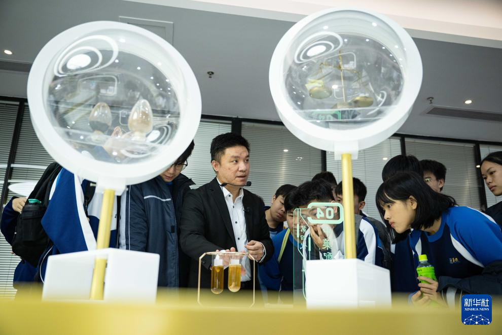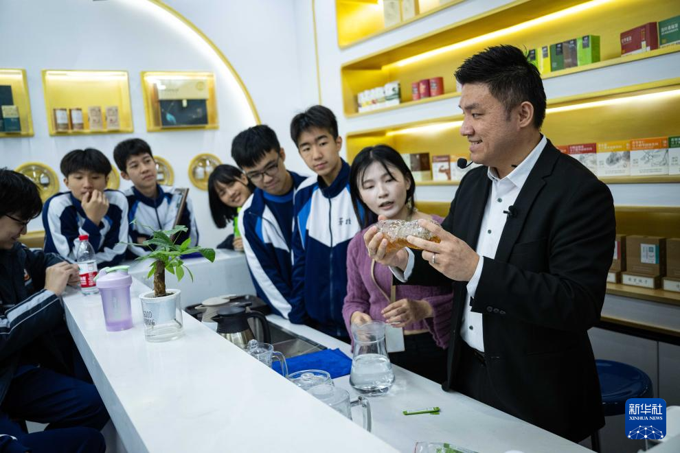 12月11日,黃滋才(右一)在位于橫琴的分子態(tài)(珠海橫琴)中醫(yī)藥健康產(chǎn)業(yè)發(fā)展有限公司的植物(現(xiàn)代中藥)分子博物館內與澳門勞校中學的學生交流。