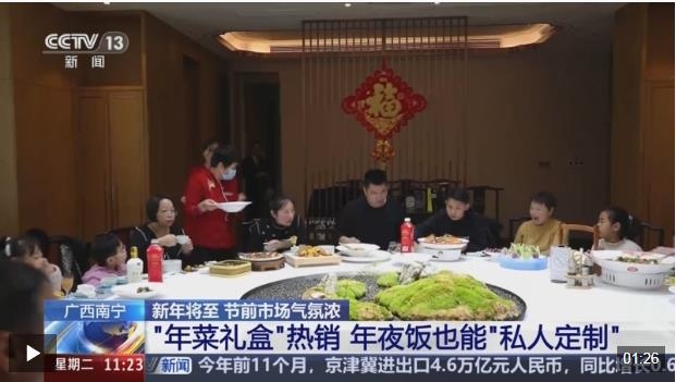 在廣西南寧,很多餐廳都開始了“年夜飯預(yù)訂”,并且在線上推出了“年菜禮盒”“年夜飯外賣大禮包”多款套餐,菜品特色主要以南寧本地菜為主,商家還能根據(jù)顧客的“私人定制”,對年夜飯?zhí)撞偷牟似愤M行調(diào)整。
