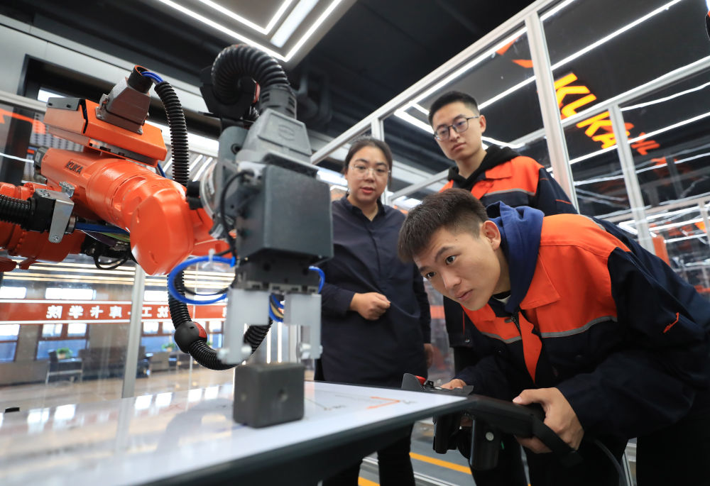 產(chǎn)教融合促就業(yè)。11月22日,沈陽工學(xué)院電氣工程及自動化專業(yè)學(xué)生操作機(jī)器人進(jìn)行物料碼垛實(shí)訓(xùn)。(新華社記者楊青攝)