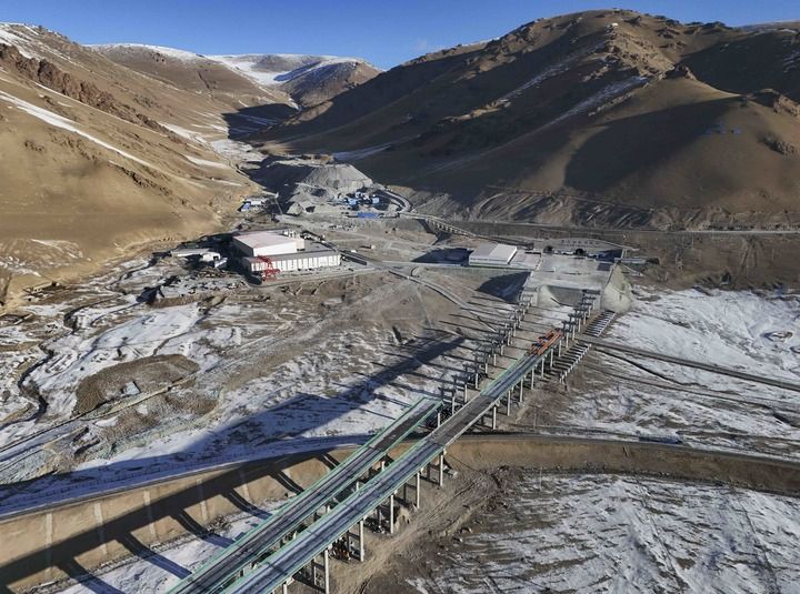這是12月25日在新疆和靜縣拍攝的天山勝利隧道出口及附近在建公路(無人機(jī)照片)。新華社記者 胡虎虎 攝