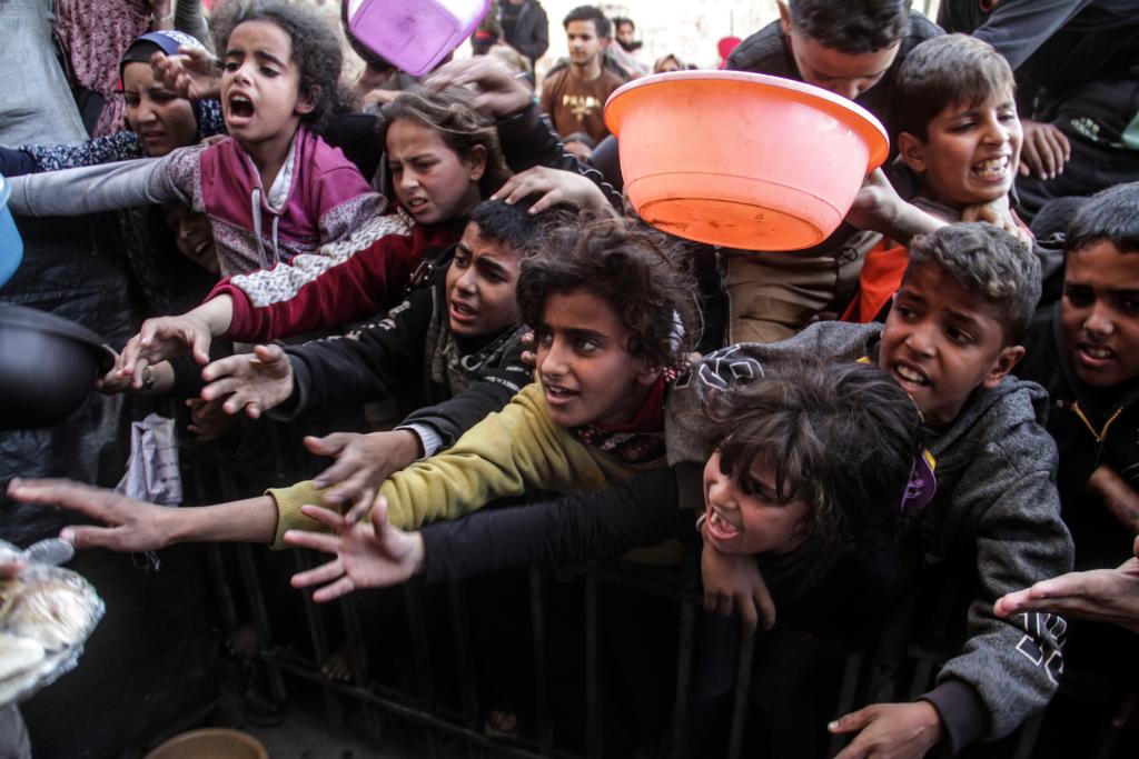 2024年12月23日,巴勒斯坦兒童在加沙城領(lǐng)取食物。新華社發(fā)(馬哈茂德·扎基攝)