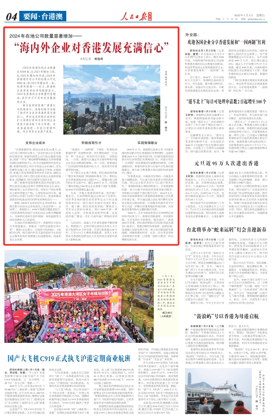 “2024年,在中央政府的堅(jiān)實(shí)支持和特區(qū)政府的開拓努力下,香港經(jīng)濟(jì)根基厚、市場韌性強(qiáng),正在變局中開新格局、穩(wěn)步前行?!闭雇?025年發(fā)展,特區(qū)政府財(cái)政司司長陳茂波充滿信心地表示,香港會(huì)繼續(xù)改革創(chuàng)新、搶抓機(jī)遇,加速融入國家發(fā)展大局,更主動(dòng)對接國家發(fā)展戰(zhàn)略,助推香港的經(jīng)濟(jì)、社會(huì)、民生等各項(xiàng)事業(yè)取得更好發(fā)展,讓香港“國際大都會(huì)”的品牌煥發(fā)新光彩。
