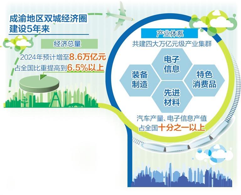 一是具有全國影響力的重要經(jīng)濟中心建設(shè)實現(xiàn)新躍升。經(jīng)濟總量上,雙城經(jīng)濟圈地區(qū)生產(chǎn)總值5年邁上了兩個萬億元級臺階,2024年預(yù)計增至8.6萬億元,占全國的比重由6.3%提高到6.5%以上;產(chǎn)業(yè)體系上,兩地共建電子信息、裝備制造、先進材料、特色消費品四大萬億元級的產(chǎn)業(yè)集群,汽車產(chǎn)量、電子信息產(chǎn)值占全國十分之一以上。