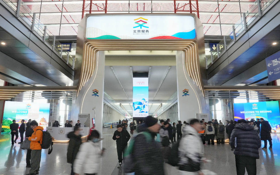 圖為2025年1月8日,在北京首都國際機(jī)場T3航站樓拍攝的“北京服務(wù)”機(jī)場服務(wù)點(diǎn)。從1月1日起,北京在首都國際機(jī)場和大興國際機(jī)場的國際到達(dá)出口設(shè)立“北京服務(wù)”機(jī)場服務(wù)點(diǎn),為來華、來京外籍人士提供金融、通訊、交通、文旅等四個主題的20余項(xiàng)高頻服務(wù),便利八方來客暢游中國。新華社發(fā) (鞠煥宗攝)