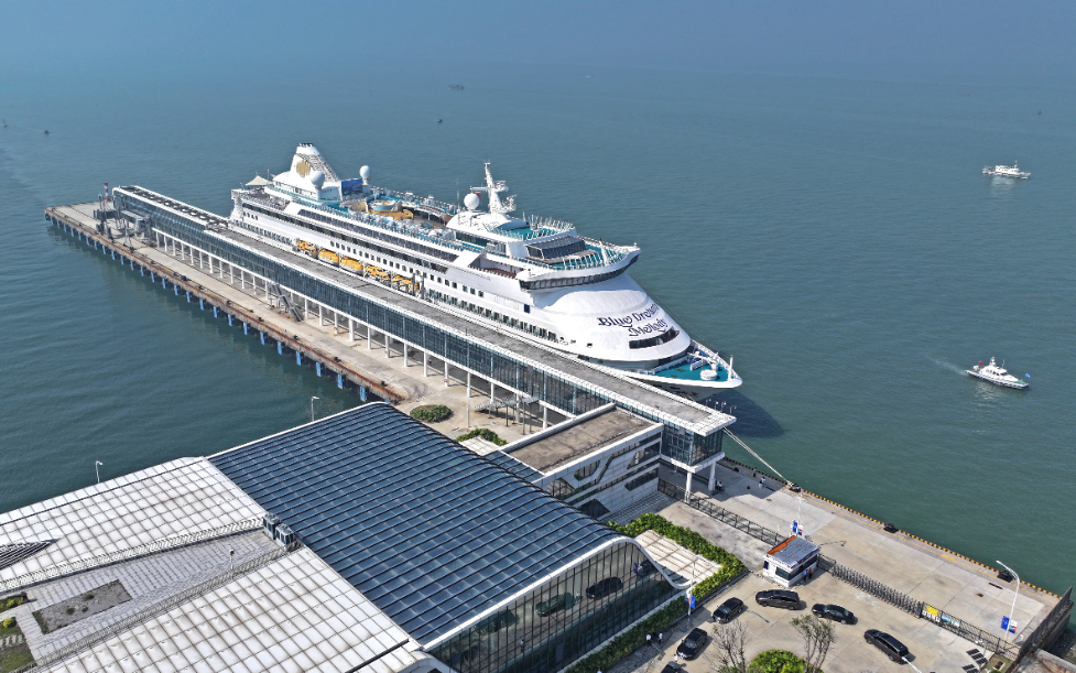 圖為2024年11月15日在北部灣國際郵輪母港拍攝的即將執(zhí)行首航任務(wù)的“藍(lán)夢之歌”號郵輪。新華社發(fā)(無人機(jī)照片,周華攝)。