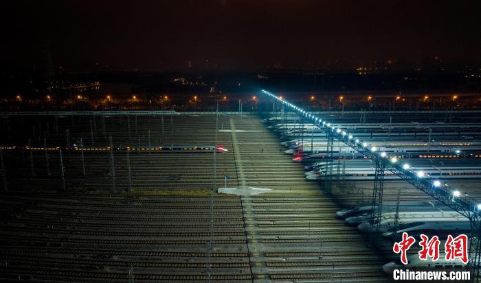 14日凌晨3時(shí),在武漢動(dòng)車段存車線上,百余組動(dòng)車整齊排列,勢(shì)如“陸地航母”,即將啟航迎接回家的人們。