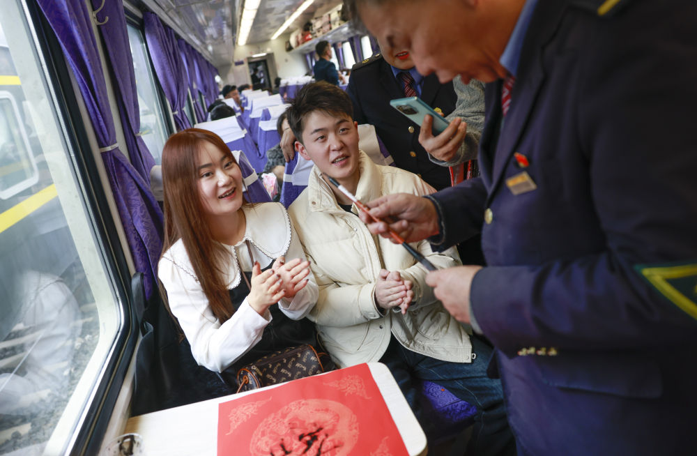 為了讓人們“滿載而歸”,列車員熱情組織旅客寫“福”字,還送上飽含心意的春聯(lián)、列車紀念徽章等禮物。