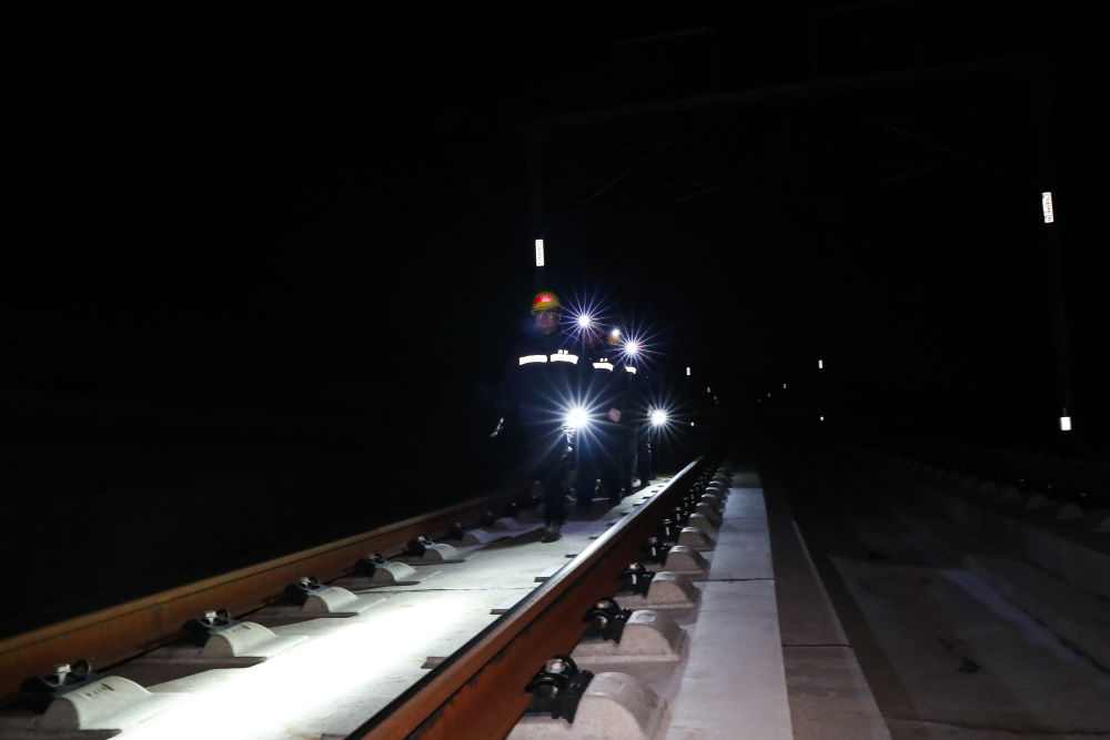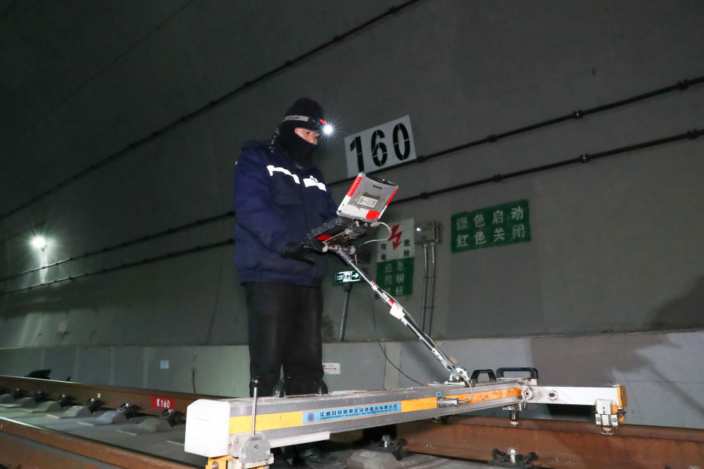 1月14日凌晨,在新烏鞘嶺隧道內(nèi),線路工使用鐵路軌道檢查儀檢查線路幾何尺寸。新華社記者 郎兵兵 攝