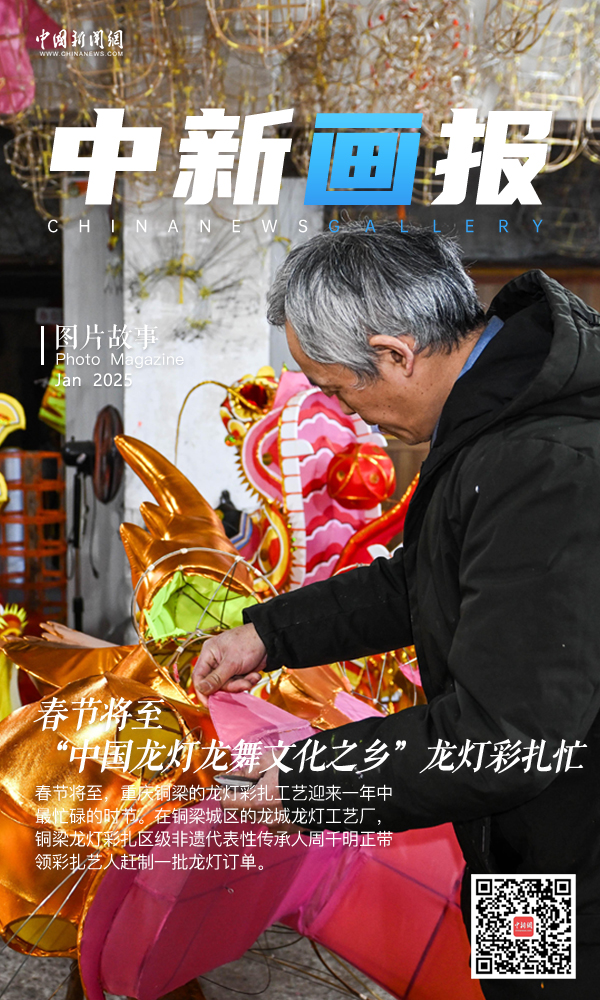 重慶銅梁區(qū)被譽(yù)為“中國(guó)龍燈龍舞文化之鄉(xiāng)”,銅梁龍燈彩扎是當(dāng)?shù)匾环N以龍文化為主題的燈彩藝術(shù)。2021年,銅梁龍燈彩扎被列入國(guó)家級(jí)非物質(zhì)文化遺產(chǎn)代表性項(xiàng)目名錄。銅梁龍燈彩扎以竹子和鐵絲為骨架,經(jīng)過(guò)扎制、裱糊、彩繪、整裝等繁復(fù)工序,最終呈現(xiàn)出栩栩如生的龍燈形態(tài)。春節(jié)將至,重慶銅梁的龍燈彩扎工藝迎來(lái)一年中最忙碌的時(shí)節(jié)。在銅梁城區(qū)的龍城龍燈工藝廠,銅梁龍燈彩扎區(qū)級(jí)非遺代表性傳承人周千明正帶領(lǐng)彩扎藝人趕制一批龍燈訂單。“由于龍燈彩扎依然保留傳統(tǒng)的手工制作技藝,一條長(zhǎng)約30米的龍燈,需要五名彩扎藝人花費(fèi)近一周的時(shí)間才能完成?!敝芮鞅硎?,每一條龍燈不僅是一件藝術(shù)品,更是一種文化的象征,其承載了傳統(tǒng)工藝的傳承與發(fā)展。圖為1月14日,周千明在裱糊龍頭。