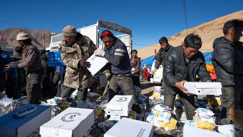 1月10日,在定結(jié)縣郭加鄉(xiāng)切村安置點,群眾分配救災(zāi)物資。(新華社記者 丁增尼達(dá) 攝)