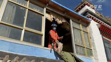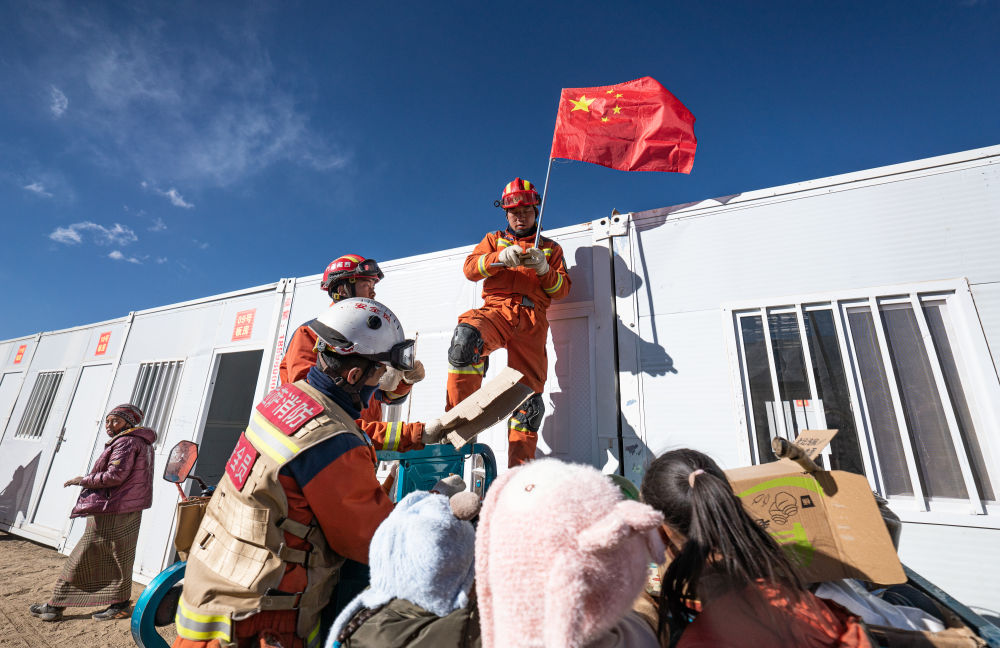 在定日縣措果鄉(xiāng)野江村,消防員在活動板房上安置國旗(1月13日攝)。(新華社記者 丁增尼達(dá) 攝)