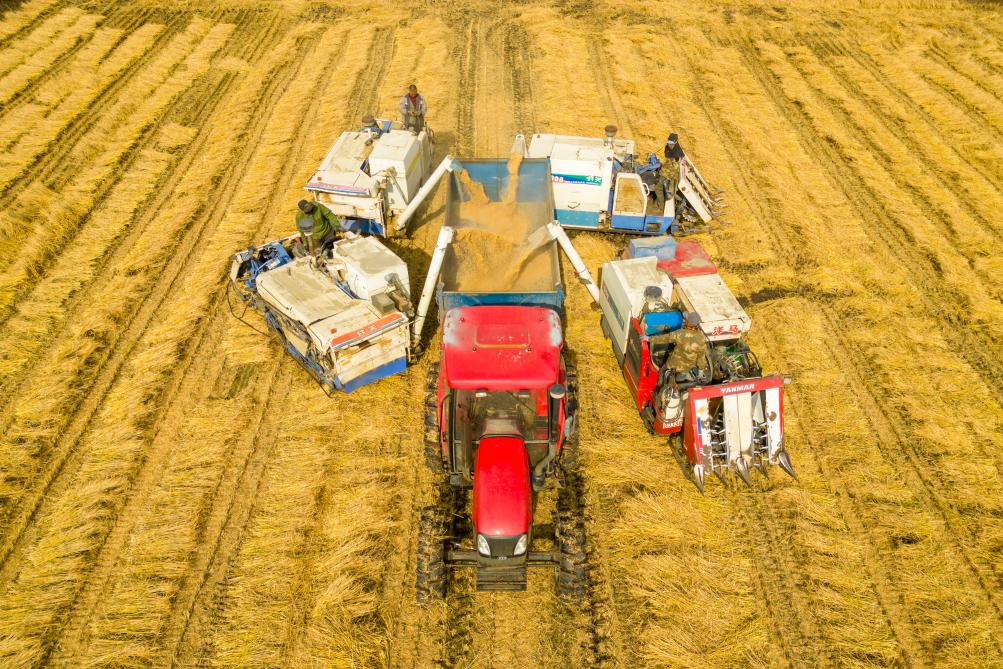 2024年10月13日,在黑龍江省綏化市北林區(qū)雙河鎮(zhèn),村民駕駛收割機(jī)進(jìn)行卸糧作業(yè)(無人機(jī)照片)。新華社記者 張濤 攝