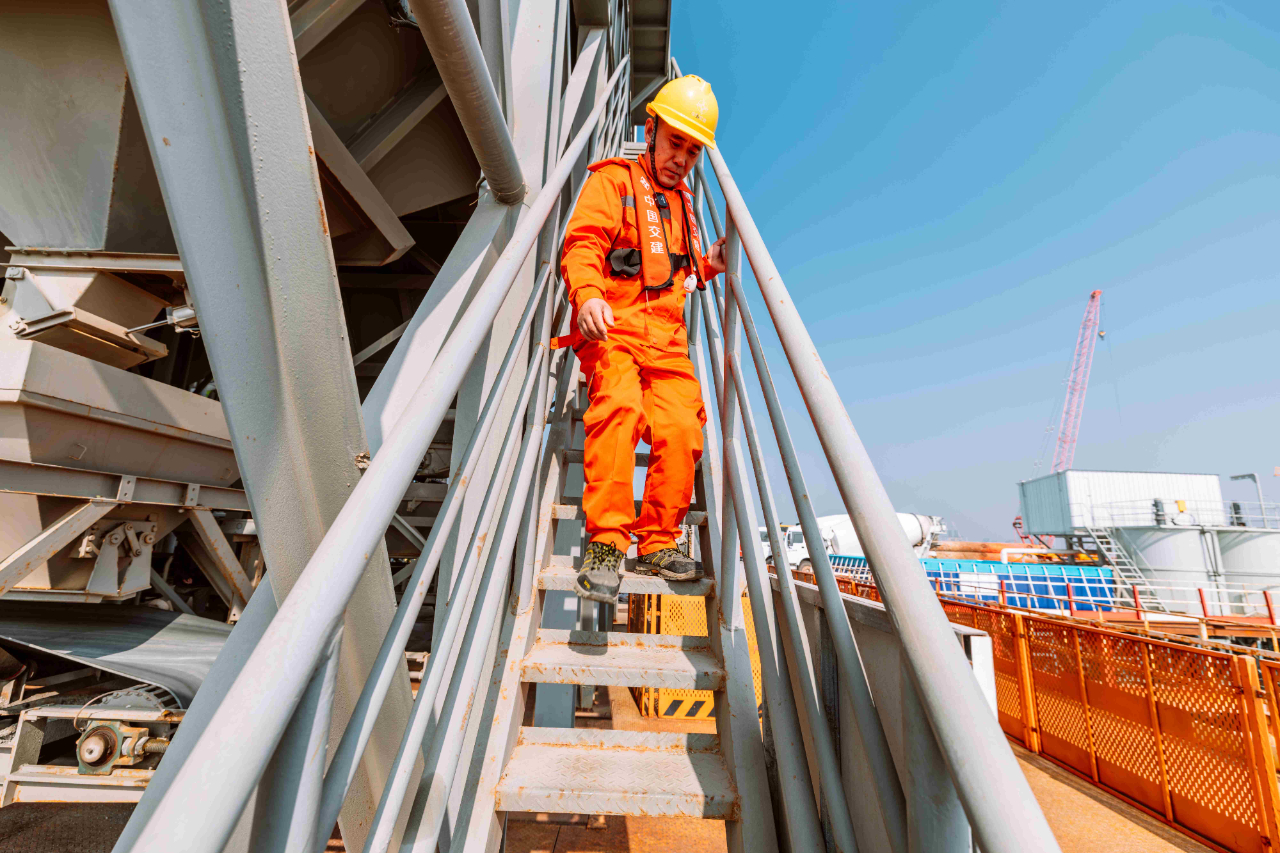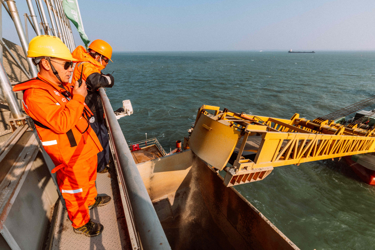 1月17日,夕陽下的廈門劉五店港區(qū),北風(fēng)勁吹。在距離中交一公局集團(tuán)廈金大橋(廈門段)項(xiàng)目海上平臺混凝土操作員梁芝敬站立位置不到30米的洋面上,一艘船身印有“帆順168”字樣的補(bǔ)料船,裝載著4000多噸砂石緩緩抵近。船頭前方延伸出一條25米長的傳送皮帶,將船上的砂料源源不斷地送抵老梁眼前的鋼制固料斗內(nèi)。當(dāng)天他們要趁著海水退潮帶來的作業(yè)窗口,為站里補(bǔ)上700噸機(jī)制砂和900噸粒徑10到20毫米的小石子,以確?;炷琳旧a(chǎn)不停機(jī)。