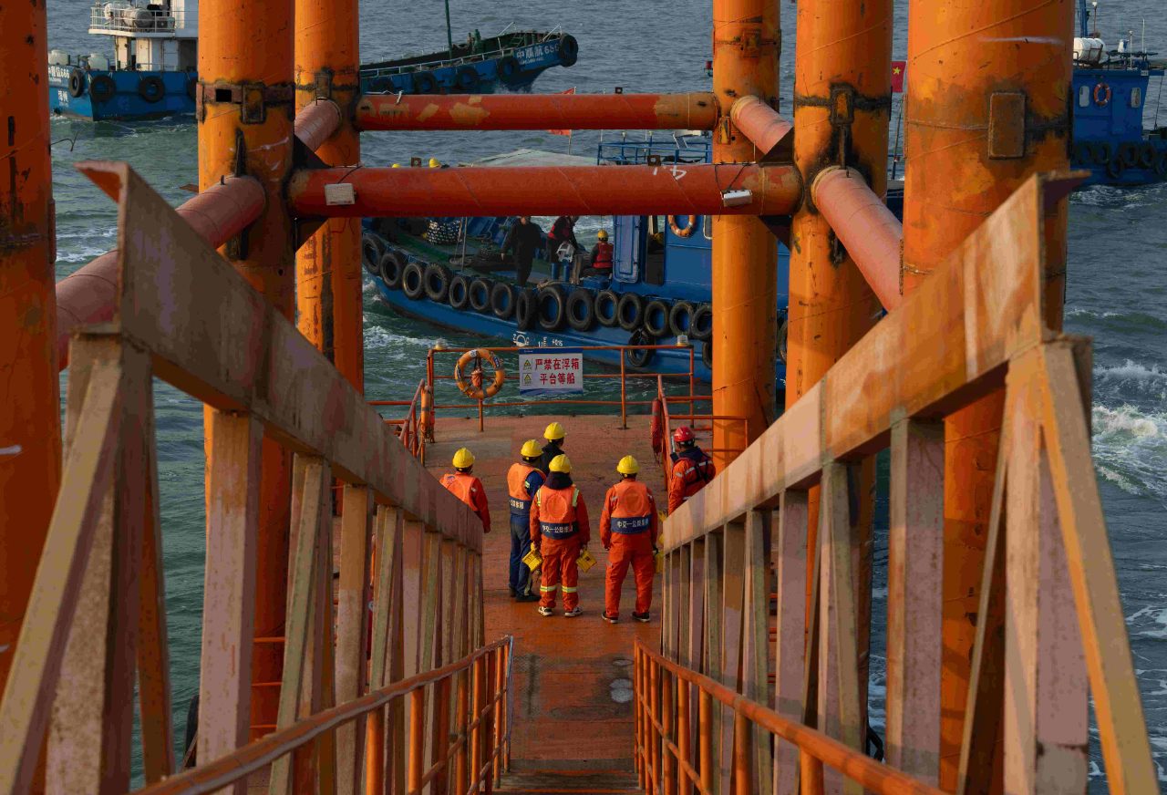 梁芝敬和工友們工作的位置在離岸2海里的海上。一座總面積5萬多平方米的海上平臺,構(gòu)成了建設(shè)者們生活和工作的海上空間。工人們加班建設(shè)的劉五店航道橋,是廈金大橋(廈門段)關(guān)鍵控制性工程,全長1948米,是福建省內(nèi)最大跨徑橋梁,也是福建省首座全離岸式海中懸索橋。春節(jié)前,項(xiàng)目部要完成沉井系梁6000方以及主塔套箱6640方封底混凝土澆筑任務(wù)。為此,梁芝敬和工友們需要不間斷倒班作業(yè),以保障工程任務(wù)能夠如期完成。而記者采訪時(shí),距離梁芝敬上一次離開海上平臺,已經(jīng)過去57天。