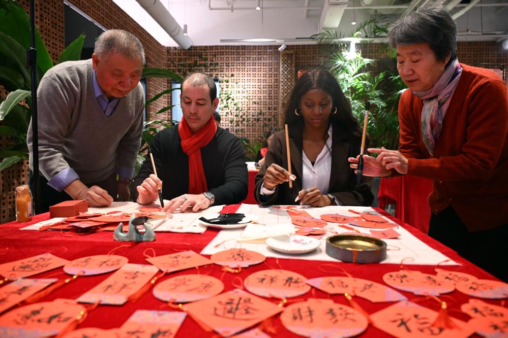 1月17日,外國(guó)人在大聯(lián)歡活動(dòng)中體驗(yàn)書(shū)法。當(dāng)日,“春暖朝陽(yáng)·巳巳如意”中外居民大聯(lián)歡新時(shí)代文明實(shí)踐活動(dòng)在北京朝陽(yáng)區(qū)左家莊街道舉行。新華社記者 金良快 攝