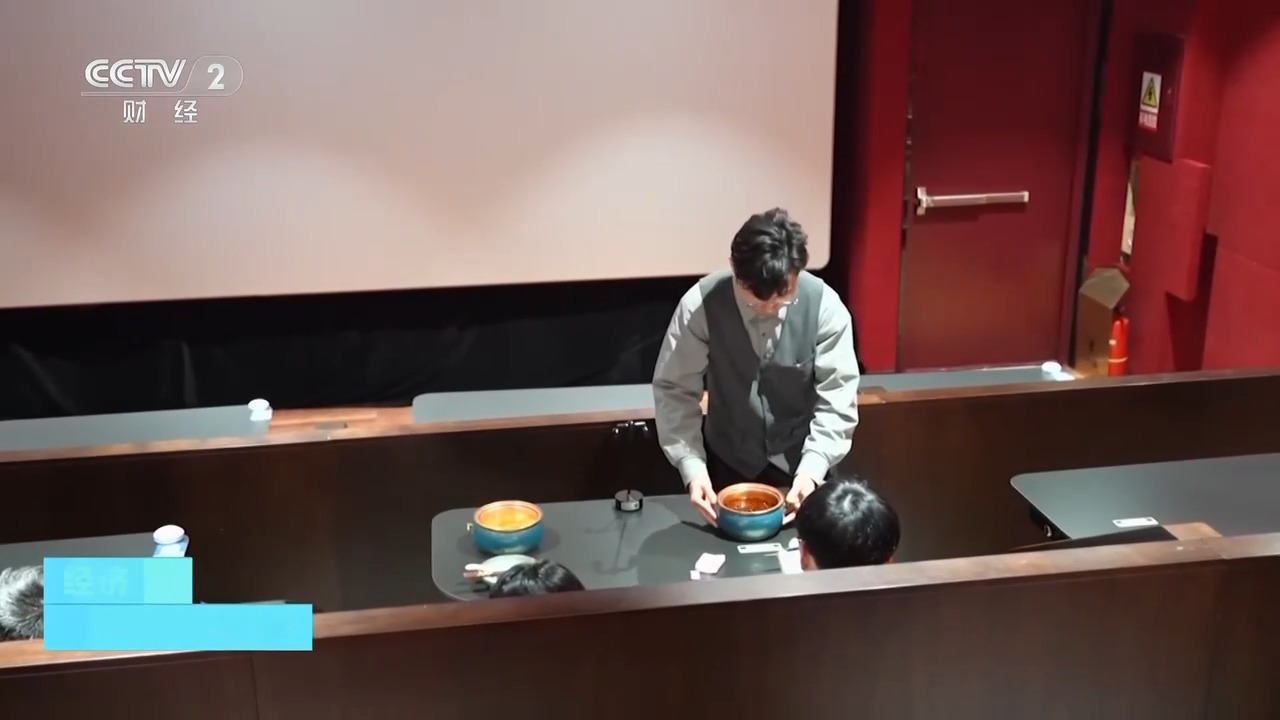 在江蘇蘇州的這家影院,不僅把餐桌、點餐二維碼引入了影廳,還創(chuàng)新改造了一間專門的火鍋影廳。記者采訪時正值晚飯時間,觀眾取票入座,掃碼點餐,就著熱氣騰騰的火鍋看電影,別有一番風(fēng)味。