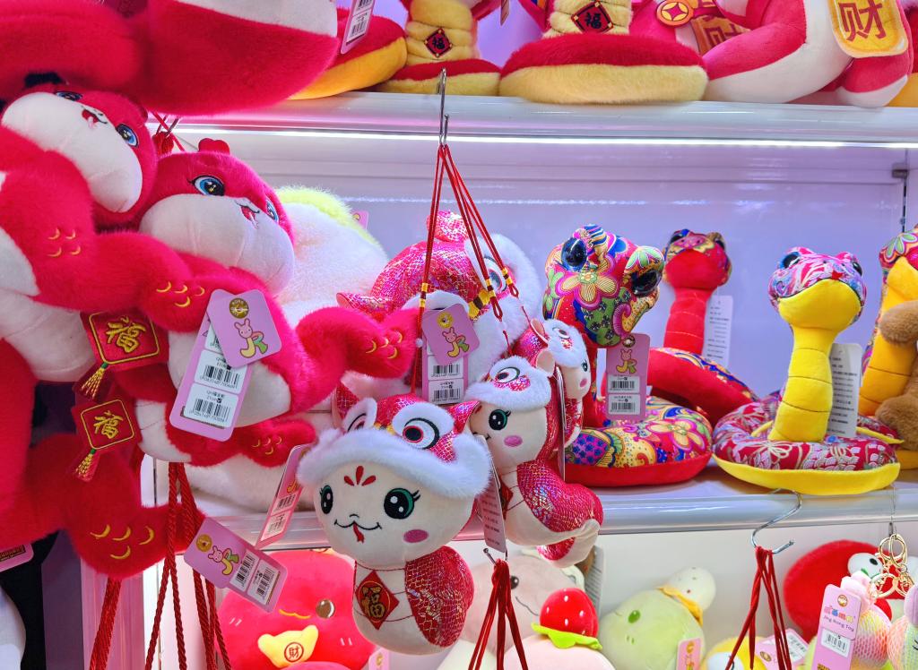 圖為義烏晶榮玩具商鋪的人氣商品——“福寶蛇”和布藝蛇。新華社記者 鄭可意 攝