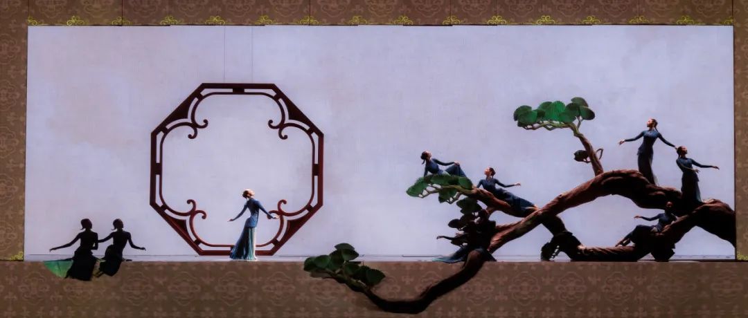 這是一幅工筆畫般的舞蹈,“細膩的平面美”貫穿始終。多處剪影的運用更是剝離了立體細節(jié),只留下氣韻流轉(zhuǎn)的線條,將所有的視覺重心都集中在平面構(gòu)圖之中。整個畫卷上,舞者化身成畫布上精心點綴的筆觸,風(fēng)枝搖綠影,鵲語落花間,每一個動作的鋪陳、每一次舞姿的凝固,都精致得令人屏息。