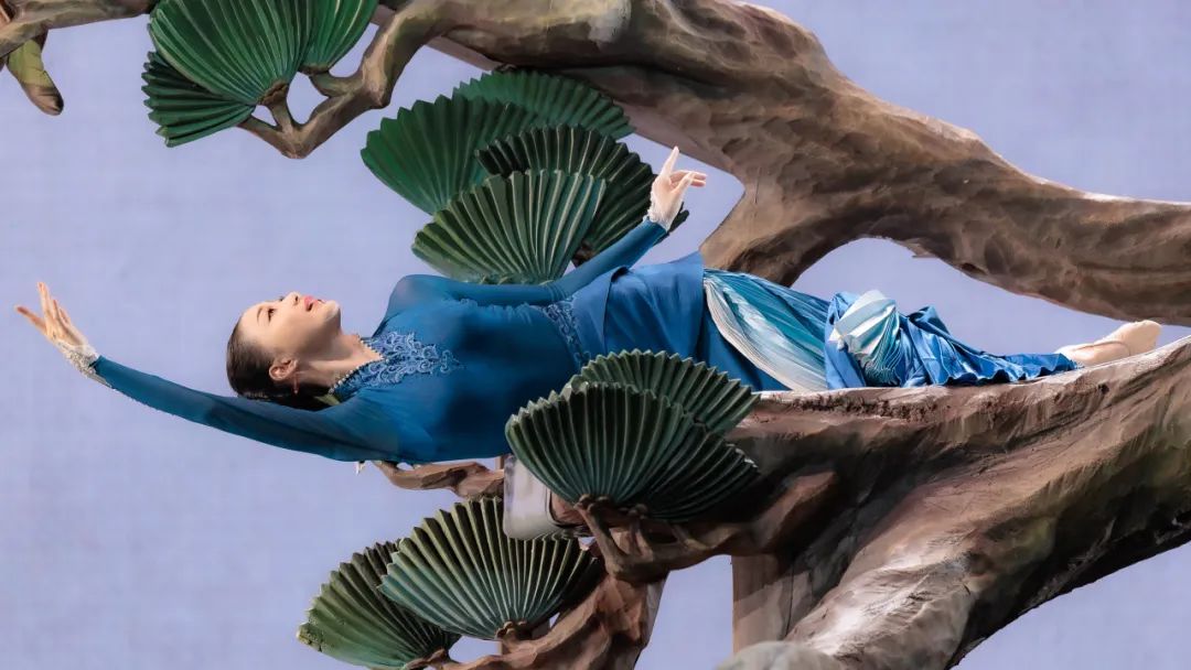 宋畫以筆觸細膩、意境深遠著稱,尤其是花鳥畫,在宋朝迎來了獨樹一幟的黃金時代。編導(dǎo)參考大量宋畫作品,尤其從南宋畫家林椿的《十全報喜圖》中獲取靈感,將宋畫的美學(xué)哲學(xué)完美地轉(zhuǎn)譯為舞蹈中的構(gòu)圖邏輯。舞臺背景是紋理清晰的畫布,幕簾和升降地屏搭建出裱框,整個舞臺如同從水平面上翻轉(zhuǎn)而立,變成巨幅的國畫卷軸。