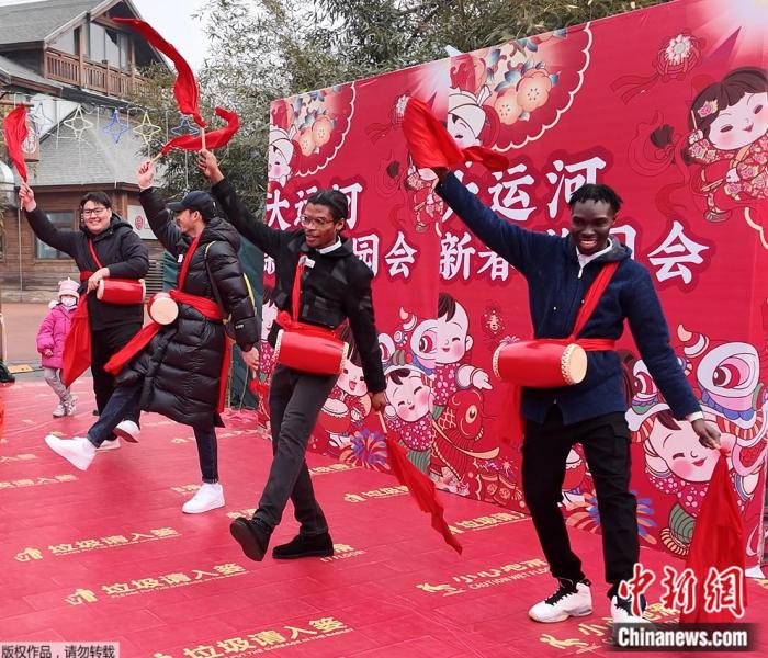 來自北京工業(yè)大學(xué)的四位留學(xué)生在北京通州大運河新春游園會上體驗打腰鼓。中新網(wǎng) 林勐男 攝