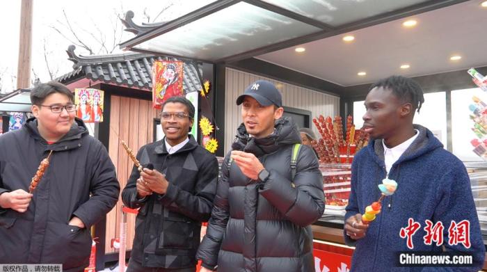 來自北京工業(yè)大學(xué)的四位留學(xué)生在北京通州大運河新春游園會上品嘗冰糖葫蘆。中新網(wǎng) 林勐男 攝