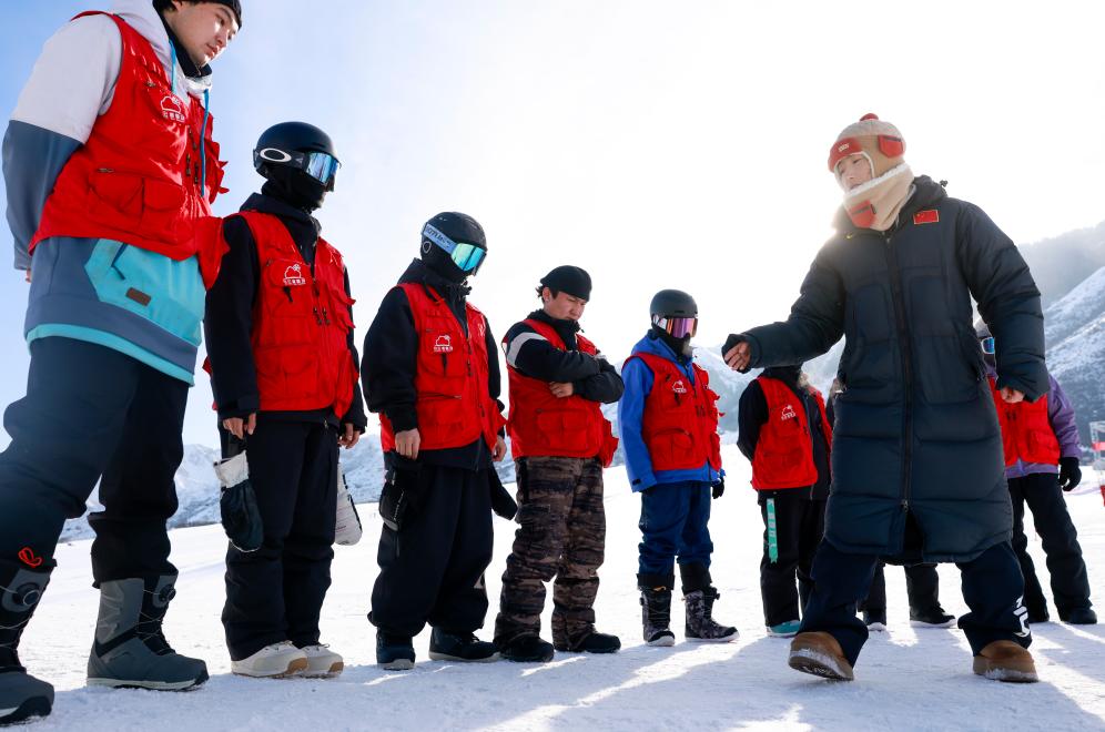 在新疆白云國(guó)際滑雪場(chǎng),海涵(右一)在為滑雪愛(ài)好者講解動(dòng)作。新華社記者 王菲 攝