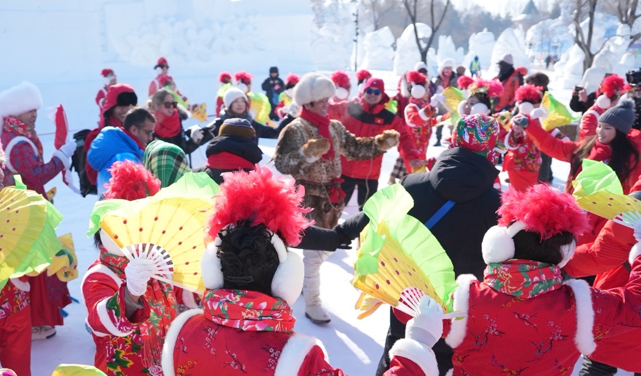 各國來賓與哈爾濱民間秧歌隊(duì)一同載歌載舞