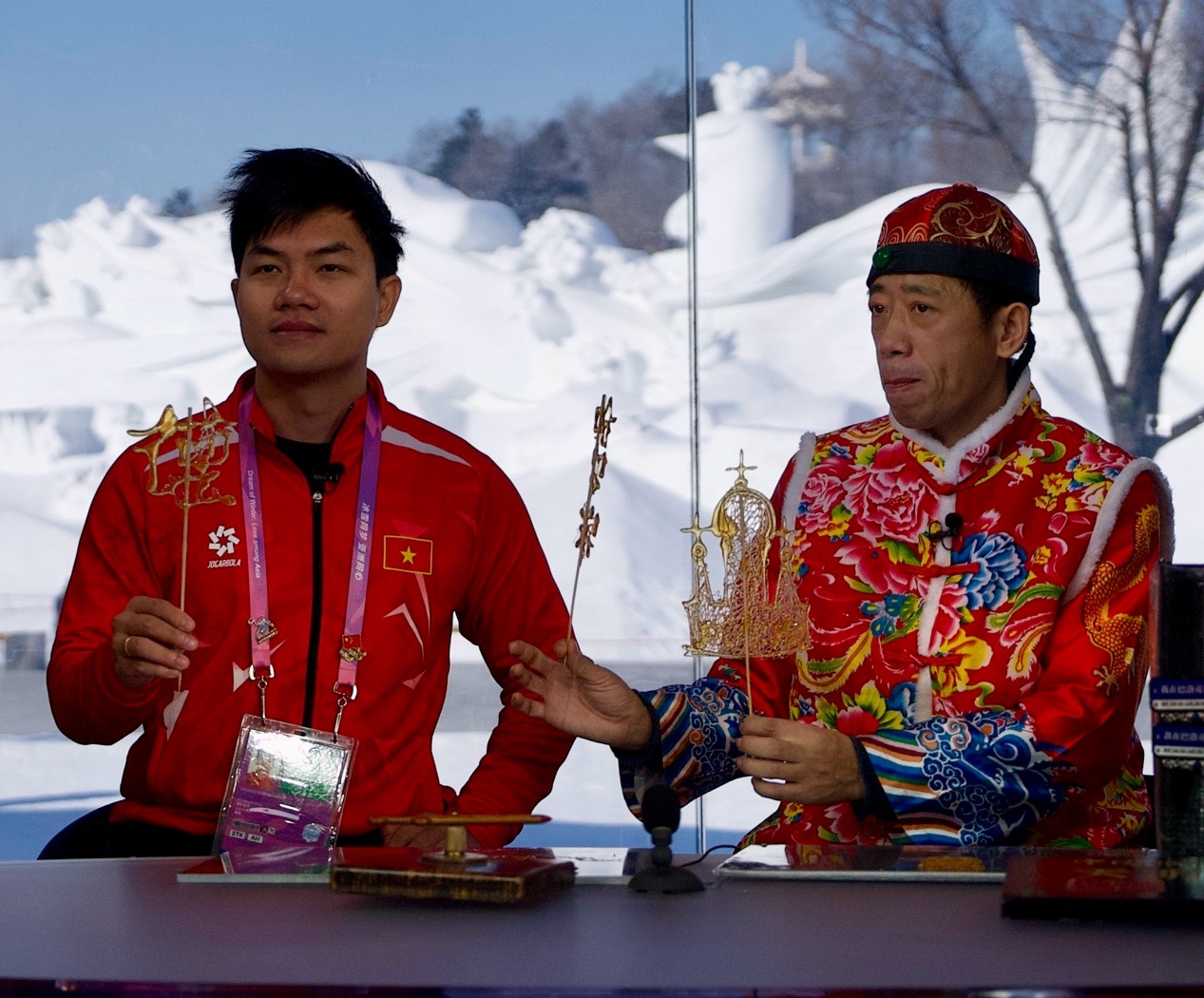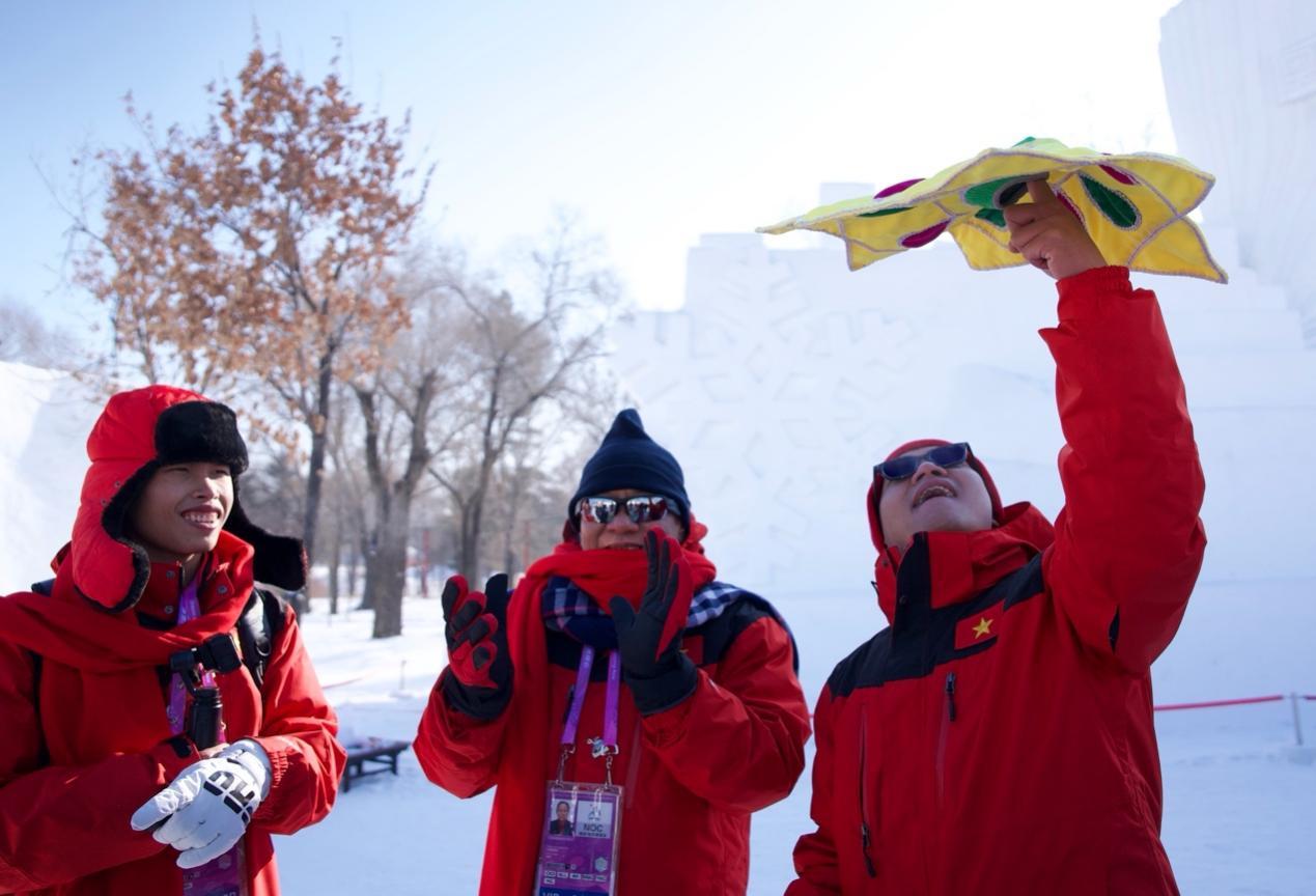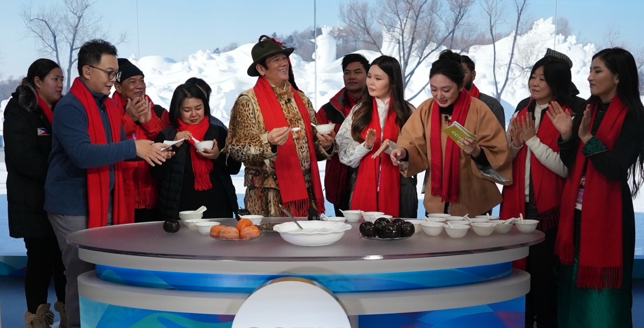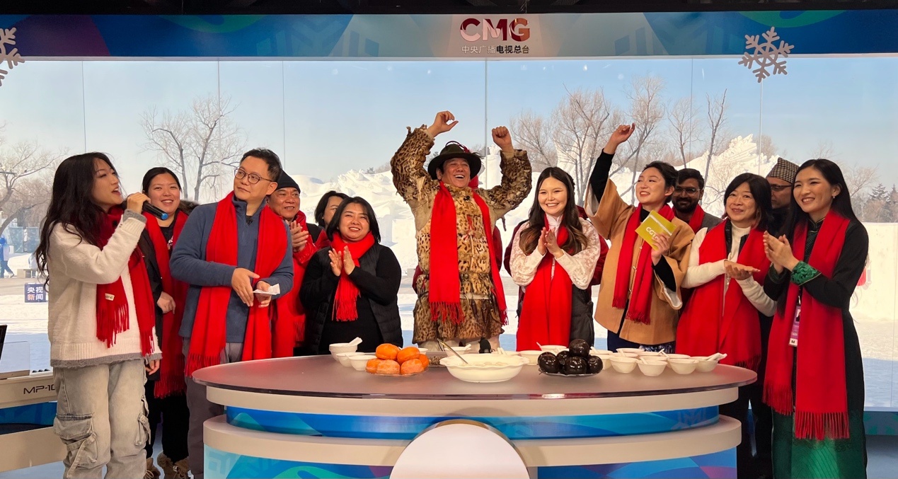 來自蒙古國、泰國、菲律賓、越南、印度、尼泊爾等國的近20位運(yùn)動(dòng)員、體育代表團(tuán)官員和媒體人,在賽場(chǎng)上比拼之后,歡聚在哈爾濱太陽島雪博會(huì)中央廣播電視總臺(tái)的演播室,在冰天雪地中共慶新春。