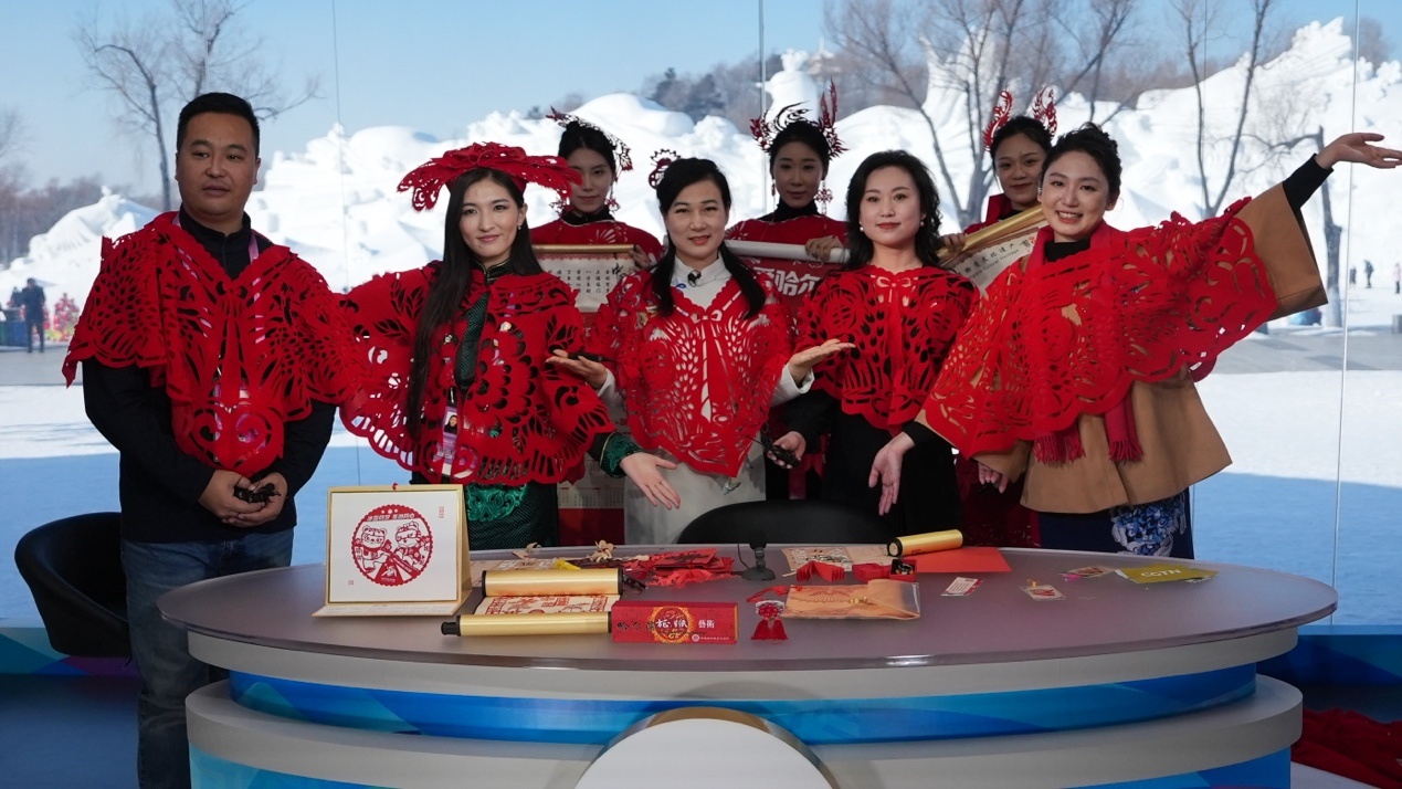 參加“當(dāng)亞冬會(huì)遇上‘非遺年’”人文交流活動(dòng)的中外嘉賓在哈爾濱太陽島雪博會(huì)CMG演播室同慶新春